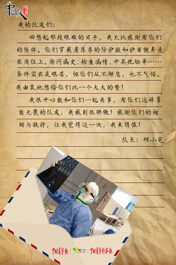 最忙的时候,分不清白天还是夜晚。在方舱医院,“防护服厚,闷气,你先休息一会儿,我来”,他总是想尽办法照顾队友。下班回到驻地,程小宪还要组织队员学习陆续印发的各种诊疗方案、防护知识。“绝不能让一例重症患者在我们手里耽误!要严把出院标准,办理出院要慎之又慎……”